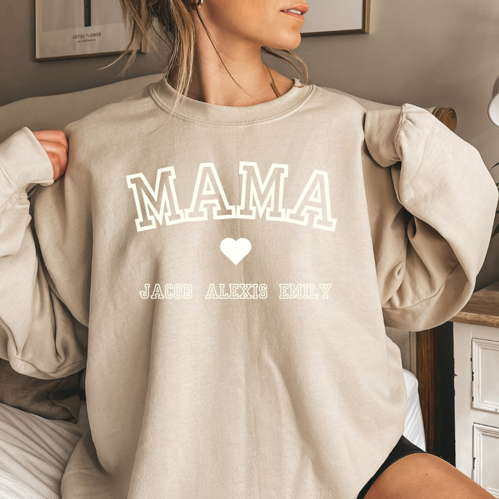 Wrap your mom in warmth with our Mama sweatshirt. Crafted from a cozy cotton blend, it's skin-friendly and adorned with a heart-touching customizable design. A trendy yet timeless piece for the stylish and sentimental. It's a cozy statement of love for a most important woman in your life.