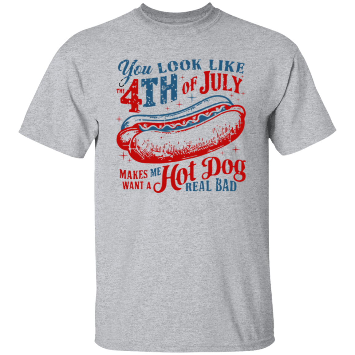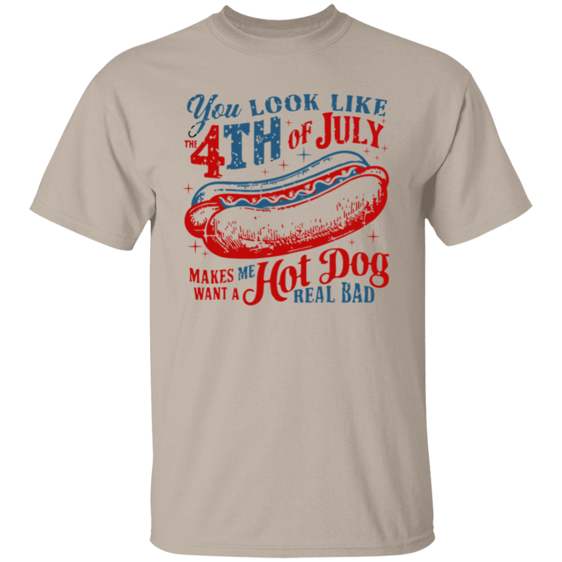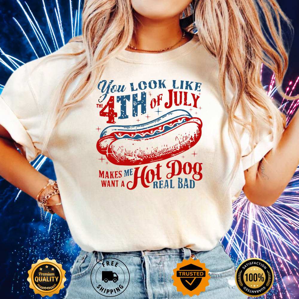 Season your 4th of July celebrations with the humor and style of our eye catching t-shirt! The vibrant design features the cheeky phrase, "You Look Like the 4th of July Makes Me Want a Hot Dog Real Bad!" paired with red, white, and blue accents. A delightful hot dog illustration adds a fun twist, making this shirt a standout piece for any occasion. Perfect for barbecues, fireworks, or everyday wear, it’s designed to bring joy and showcase your love for Independence Day. Don’t miss out on this festive must-have – order yours today and make a statement this 4th of July!
